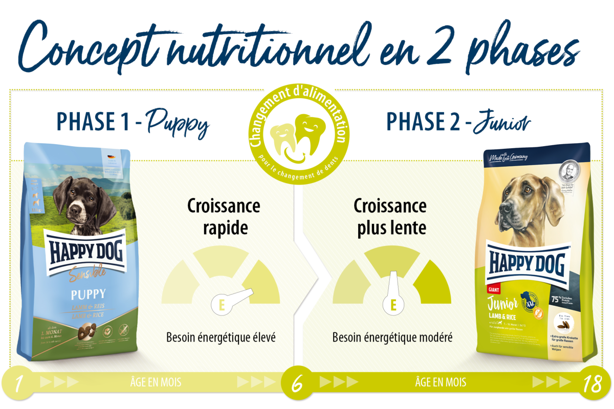 À partir de l’âge de 7 mois, l'intensité de la croissance des chiots diminue lentement. En particulier chez les jeunes chiens de très grande race, l'alimentation doit être adaptée aux besoins en protéines et énergétiques changeants, afin de prévenir les troubles de croissance liés à l'alimentation. Happy Dog Junior Giant Agneau et Riz est parfaitement adapté aux besoins des jeunes chiens de très grande race et leur assure une croissance harmonieuse. En plus d'une teneur énergétique réduite, la teneur en protéines est également adaptée.