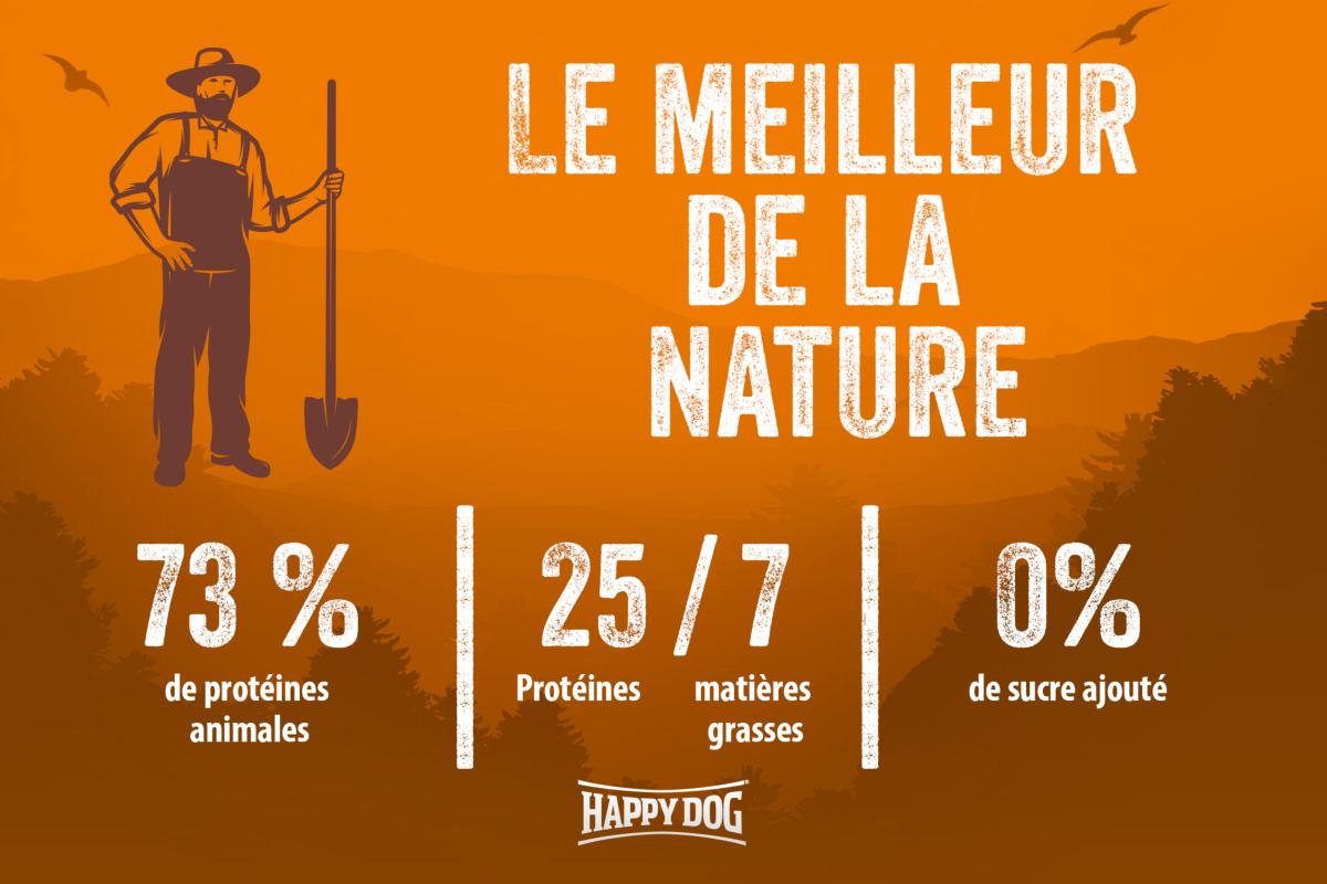 Votre chien va adorer cet aliment complet équilibré et adapté à son espèce, préparé à partir des meilleurs ingrédients de l'agriculture bavaroise. Ces croquettes croustillantes contiennent des ingrédients de haute qualité tels que de la savoureuse viande de canard, du riz très bien toléré et des céréales complètes issues de la région. La viande de canard apporte à votre chien des protéines animales de haute qualité et l’énergie dont il a besoin pour jouer et se dépenser. Les céréales complètes fournissent des fibres alimentaires essentielles. Elles aident à réguler l'activité intestinale, rassasient, facilitent la digestion et contribuent à la santé intestinale. Elles représentent également un apport important de vitamines B, de minéraux tels que le magnésium, le fer, le sélénium et le zinc et regorgent de glucides complexes. Cette recette délicieuse et saine contient également de précieuses herbes locales qui fournissent à votre chien de nombreux nutriments essentiels de manière naturelle. Grâce à sa teneur en matières grasses adaptée et à sa teneur élevée en fibres, cette recette convient également particulièrement bien aux chiens stérilisés.